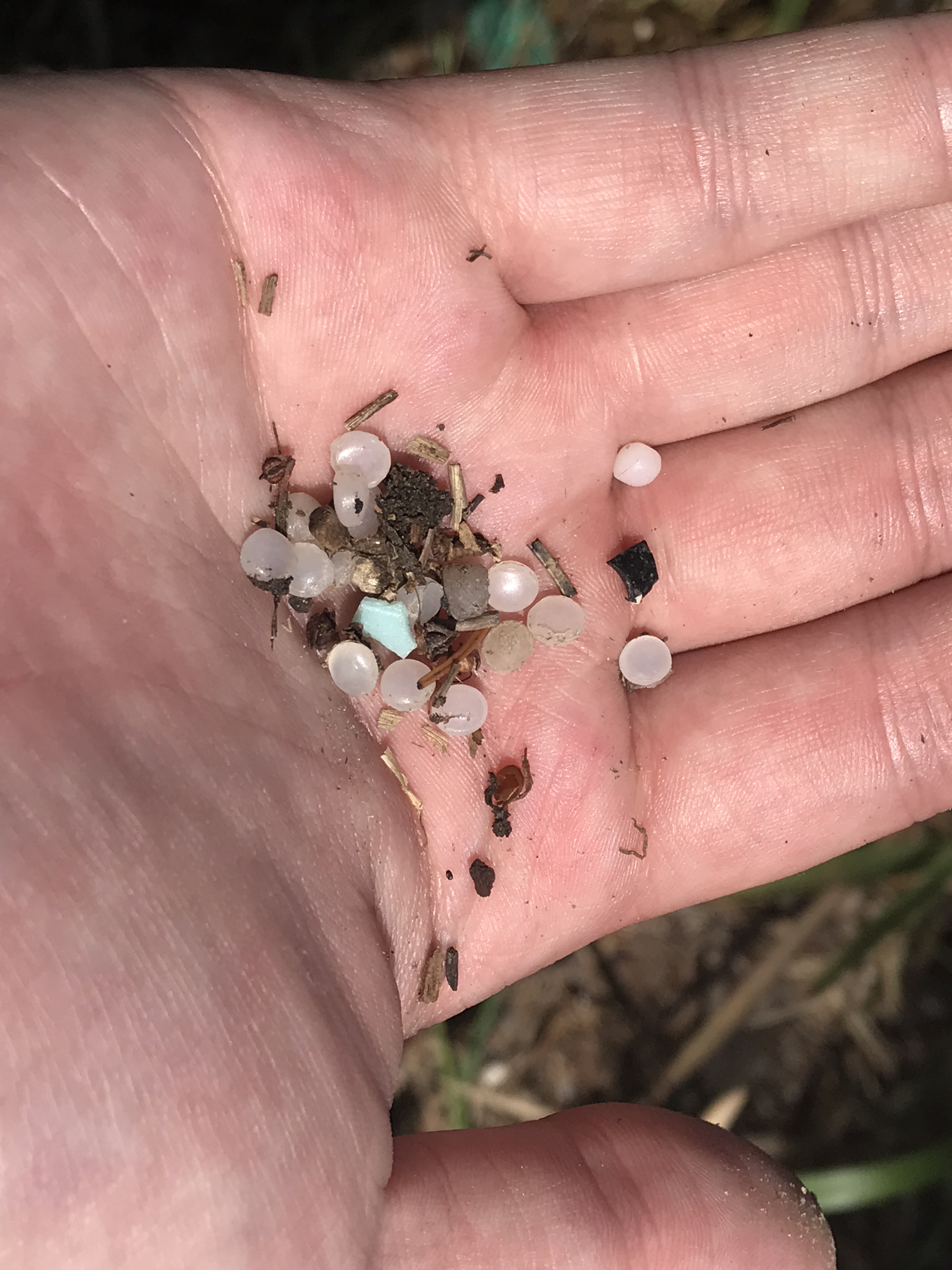 Volunteers used rakes, shovels and their bare hands, but the tiny plastic balls are still visible in the dirt even after hours of work.