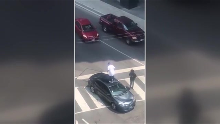 A video posted on Twitter appeared to show the man also jumping on the hood and the roof of a dark-coloured car, causing damage to the vehicle.