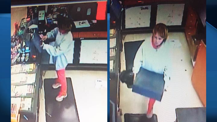 A search is underway for a woman who reportedly used a needle during an armed robbery in Prince Albert, Sask.