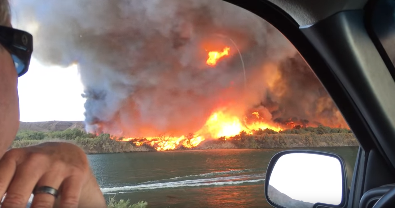 Dramatic video posted to YouTube on Sunday showed a firenado, or a whirling column of fire, shifting just a short distance to the waters of the Colorado River and becoming a waterspout.