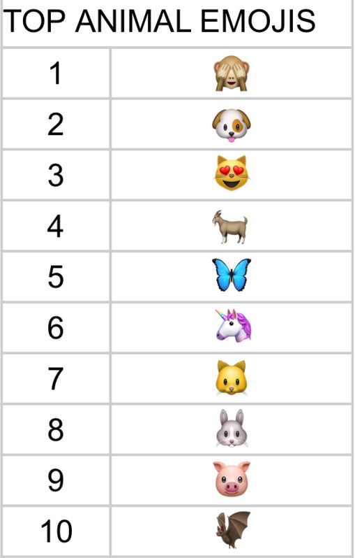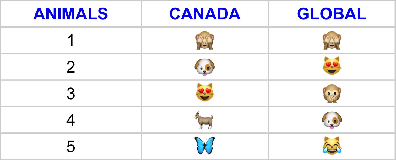 Twitter also tallied up the top animal emojis. In Canada, the top spot went to the monkey covering its eyes, followed by the dog, then the cat. Globally, the cat was used more than the dog emoji.