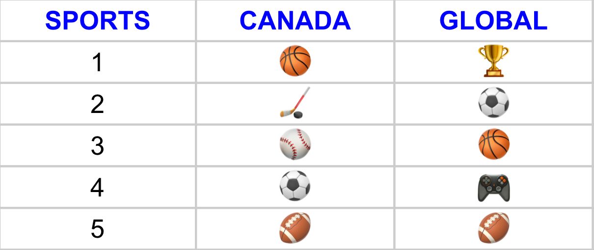 In Canada, the top five sports-related emojis this year were: basketball, hockey, baseball, soccer and football. Internationally, the order was: trophy, soccer, basketball, video game controls, football.