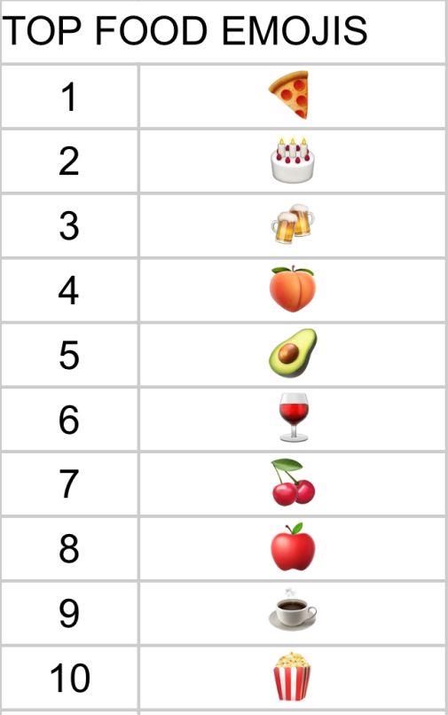 When it comes to food, the most-used emojis in Canada over the last year were, in order: pizza, cake, beers, peach and avocado.