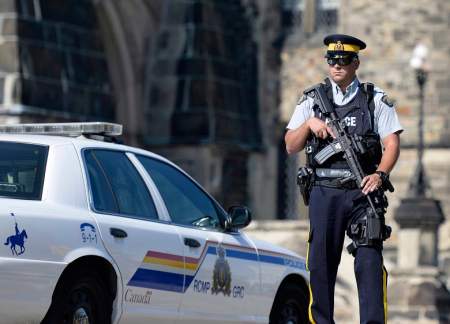 An armed RCMP officer on Parliament Hill on Aug. 11, 2016 after ISIS supporter Aaron Driver was shot dead by police in Strathroy, Ontario, during an attempted suicide bombing. THE CANADIAN PRESS/Justin Tang. THE CANADIAN PRESS/Justin Tang
