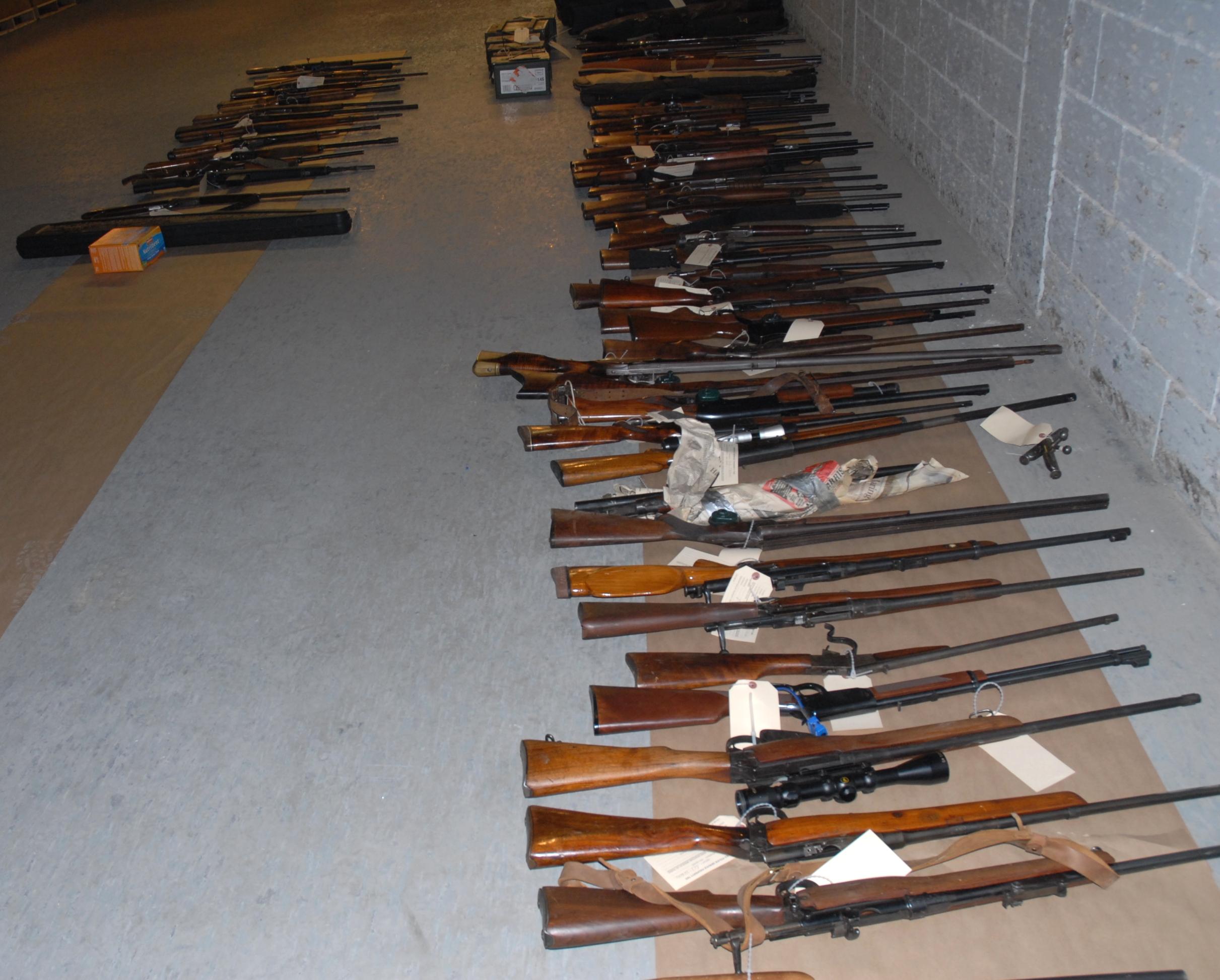 Officers raided a home on Rue St. Jean Baptiste and say they found 101 firearms and thousands of rounds of ammunition. Among the guns were 15 handguns which are restricted or prohibited weapons.