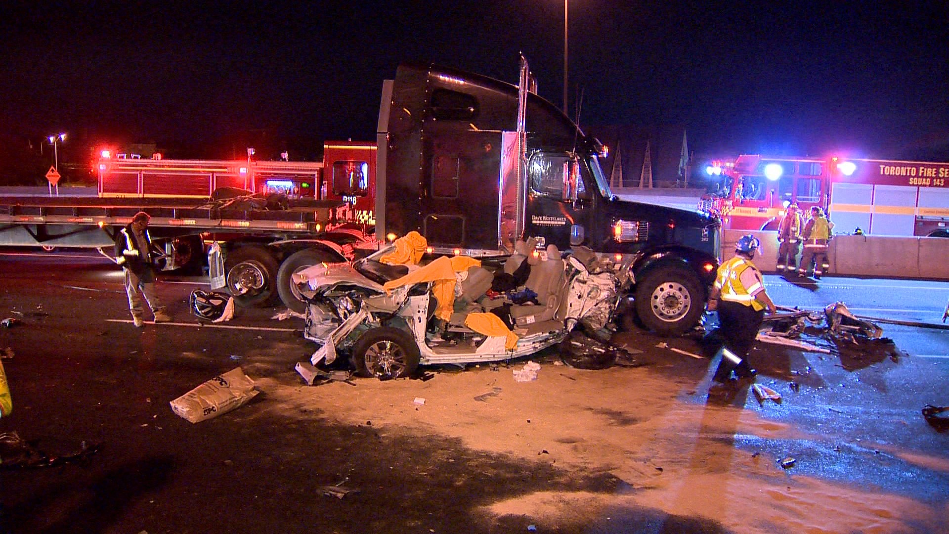 The overnight crash shut down the westbound express lanes along a 10-kilometre stretch of the busy route between Highway 404 and Allen Road.