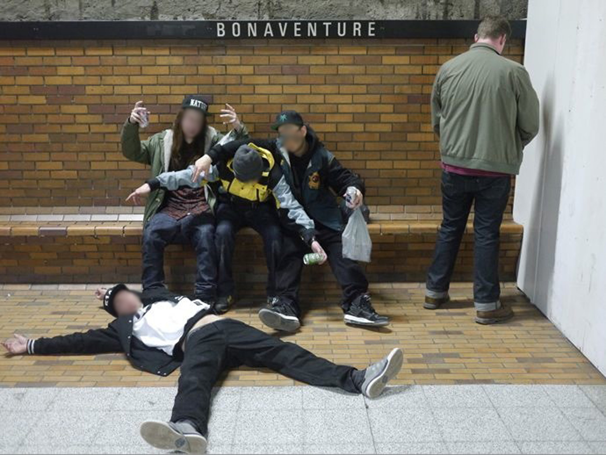 Participants are seen drinking and smoking on métro cars and platforms; vomiting in métro cars and on platforms and outside stations; urinating on station benches, tracks and walls; sitting on platform edges; and drawing graffiti outside stations.