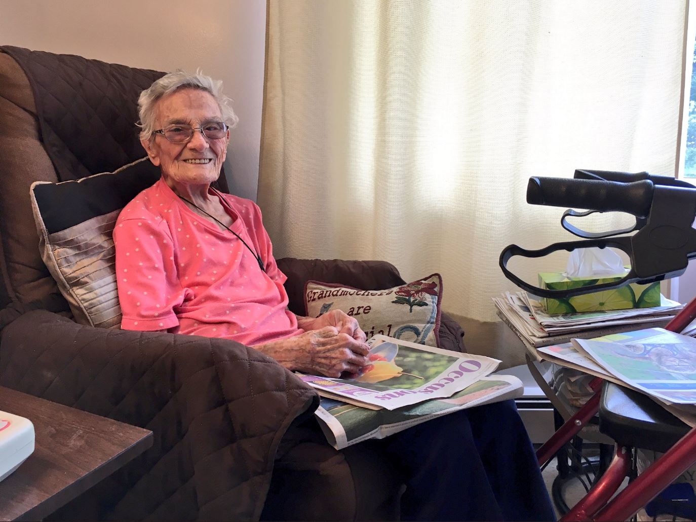 Webber likes to spend her days reading the newspaper and sewing.