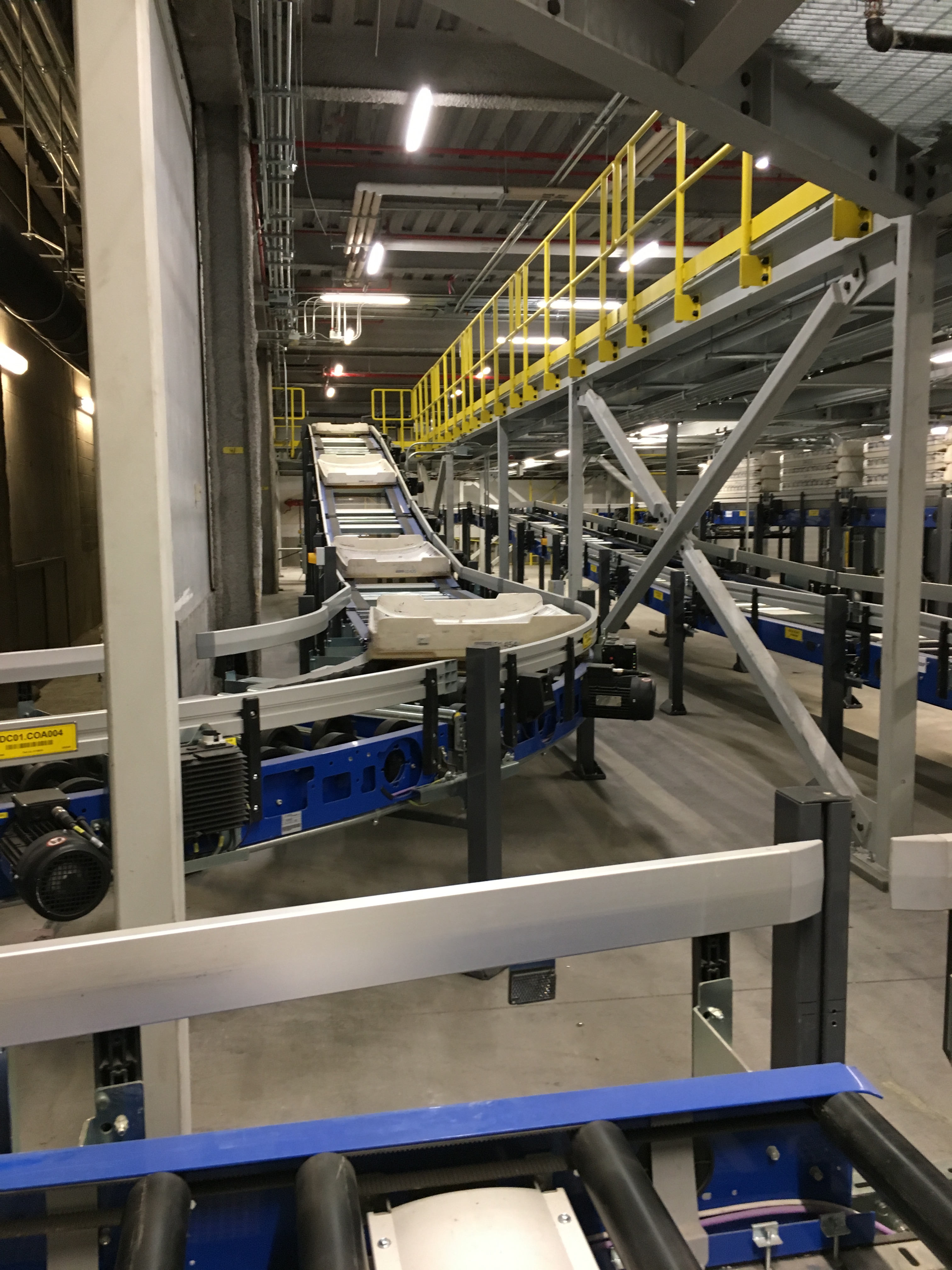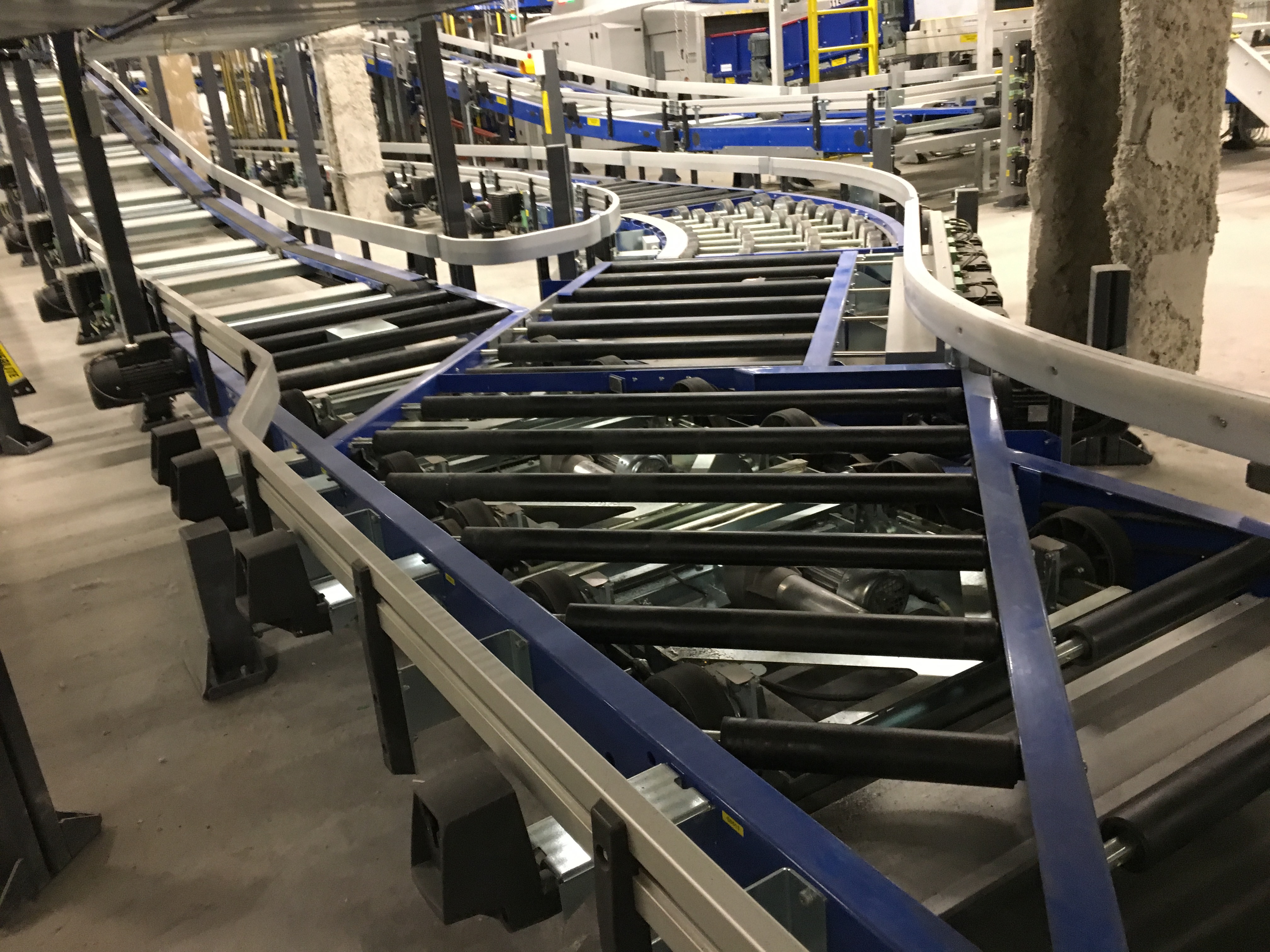 The serpentine track system that carries the totes only activates when there is cargo to move. Each roughly metre-long section of track shuts down when there is no baggage to be conveyed.