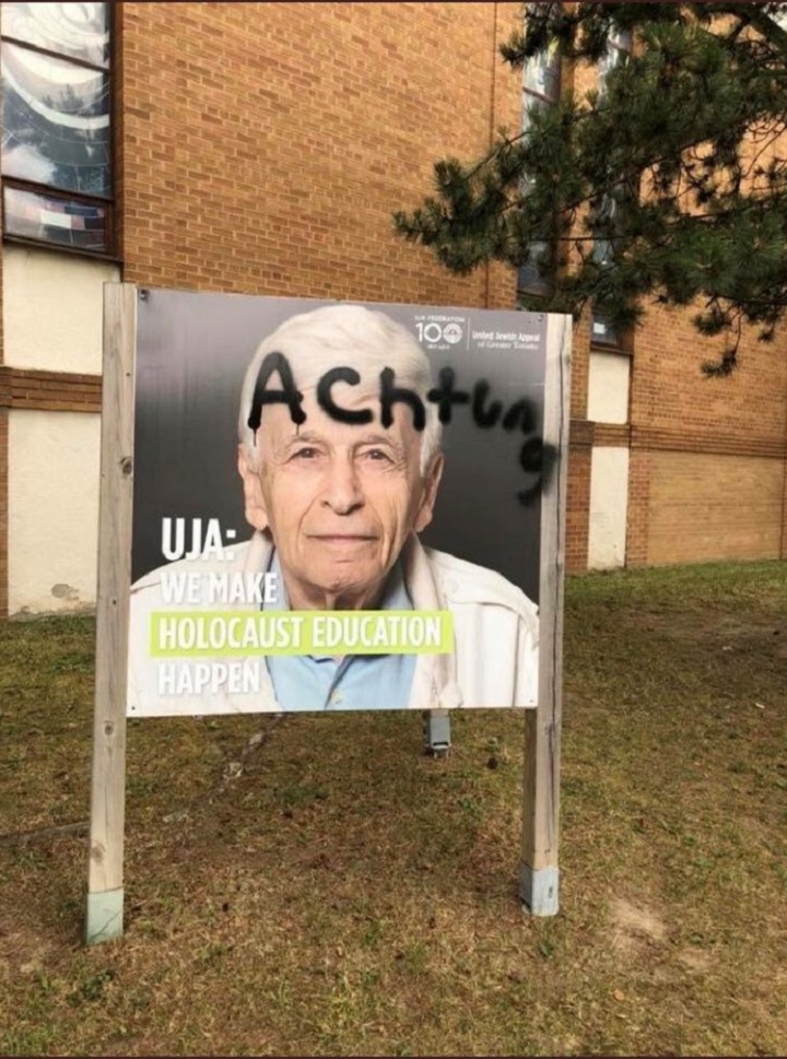 The United Jewish Appeal Federation of Toronto (UJA) said in a tweet Sunday that a sign advertising holocaust education was spray painted with the word ‘Achtung’ outside of the Sarah and Chaim Neuberger Holocaust Education Centre in North York.