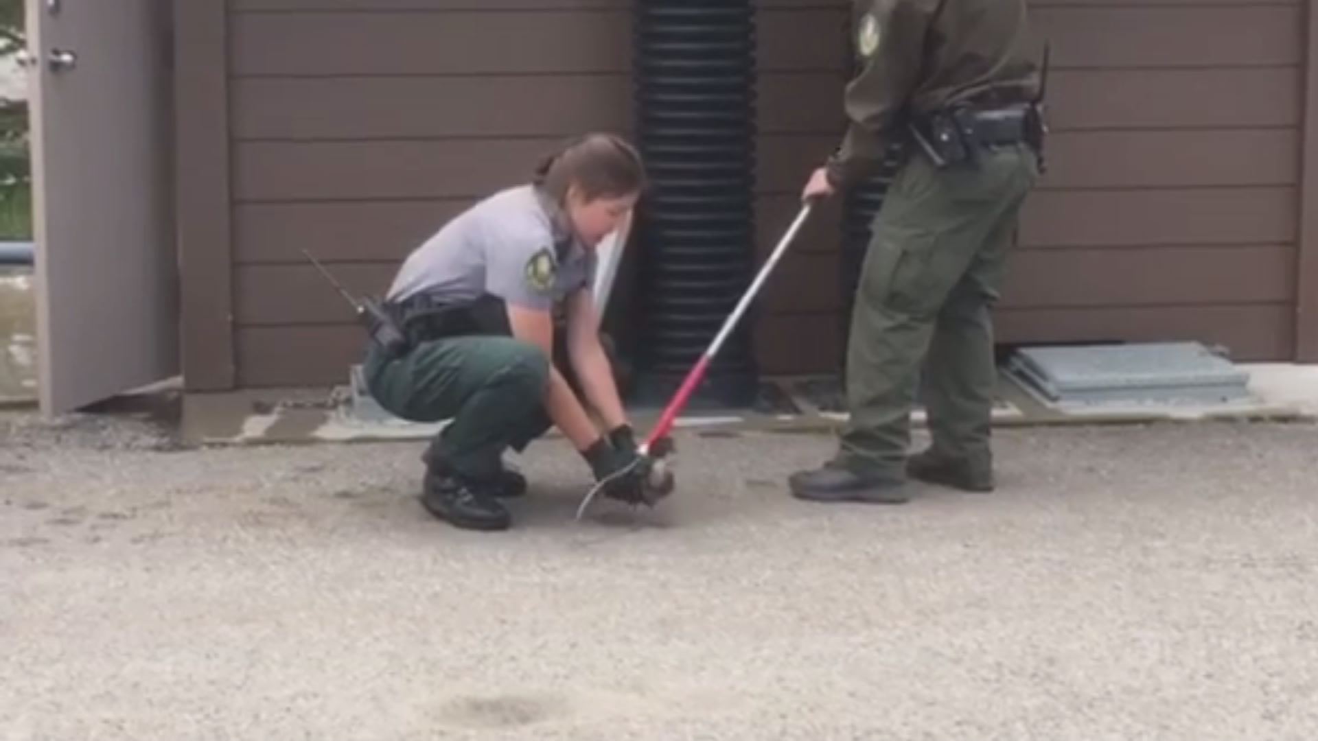 He stood guard until five conservation officers arrived on scene. They tried opening a side panel to free the bird to no avail.