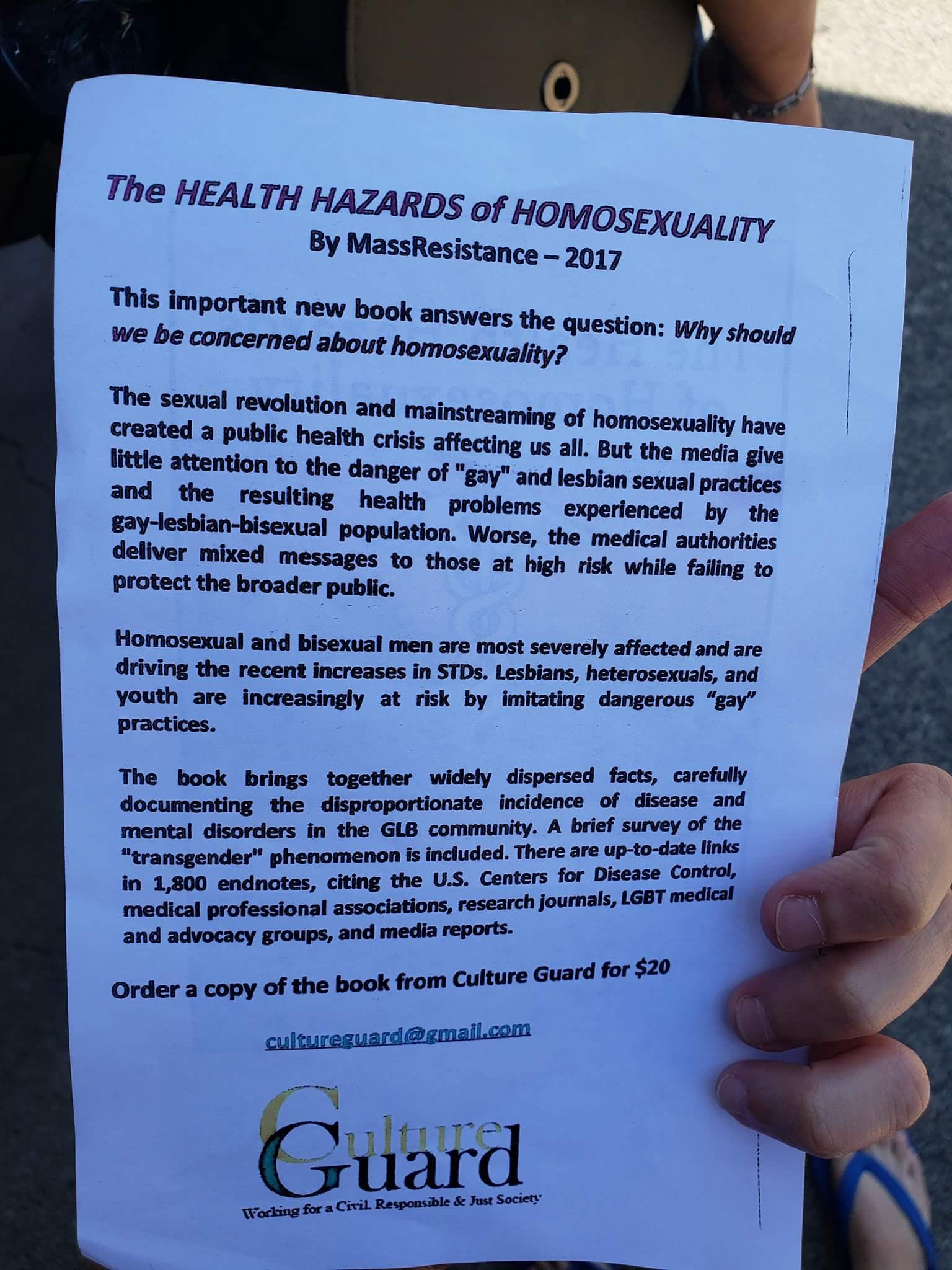 The flyers were made by the group and say that homosexuality is a health crisis.