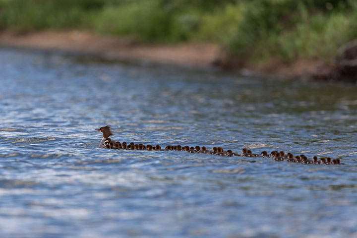 As the ducks headed out, Cizek took close to 50 shots – the best showing a common merganser, a freshwater duck, trailed by 56 ducklings in a row.
