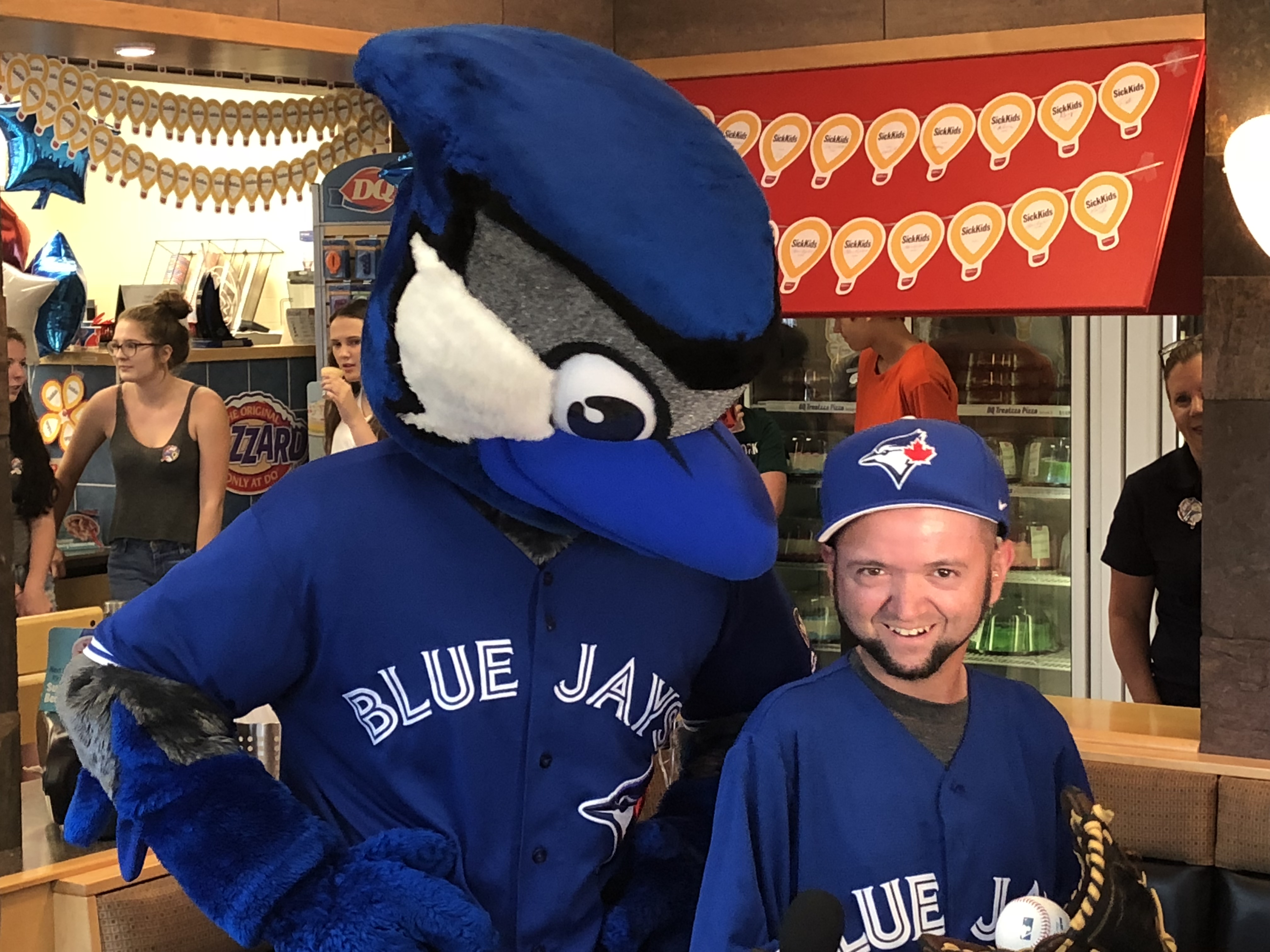 Upon arrival, Hardisty was handed a phone by Toronto Blue Jays mascot, Ace. On the line was Toronto Blue Jays announcer Buck Martinez to deliver the news to the longtime fan that he will have the opportunity to throw the first pitch at a Blue Jays game later this summer, in order to recognize him for all the work he has done fundraising for children in need at Sick Kids Hospital.