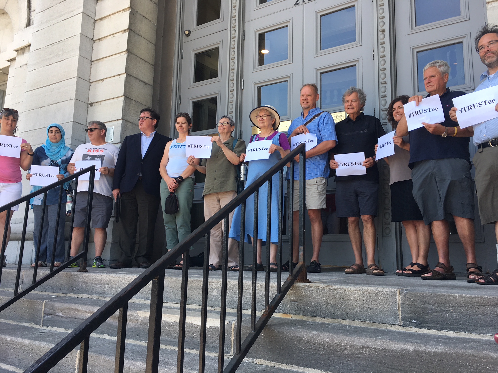 On Friday, minutes before the deadline passed to submit names for the municipal election, the group and several of their supporters gathered on the limestone steps of city hall. They held signs that read “#TRUSTee,” a hashtag they say symbolizes the group’s common goals.