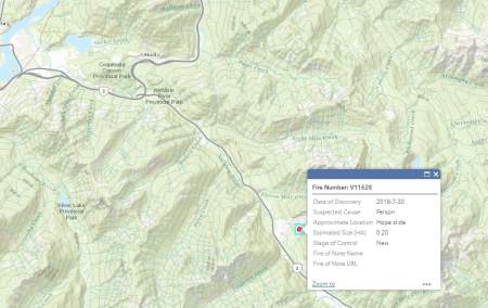 A small blaze near the Hope Slide on Highway 3 east of Hope shut down the route for about an hour Monday evening, according to the B.C. Wildfire Service.