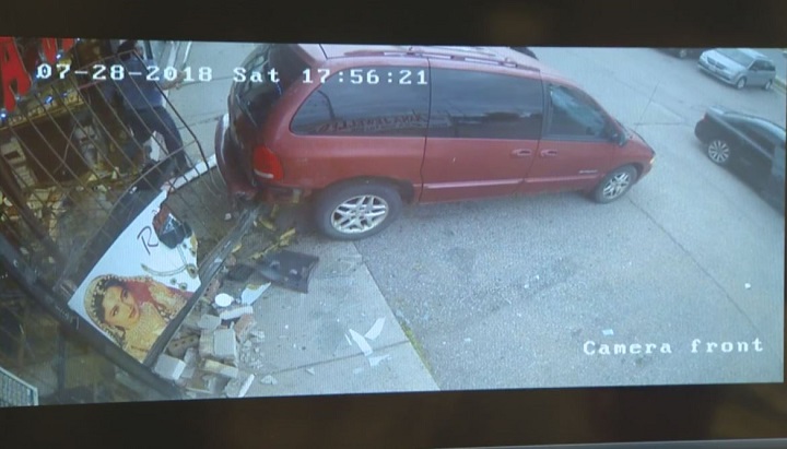 The incident happened before 7 p.m. on Saturday as Manjania and his wife were in the business. A red van can be seen in front of the business as it rams the front window repeatedly. The stone base below the window can be seen breaking away along with a wall of bars as the van pulls out of the store.
