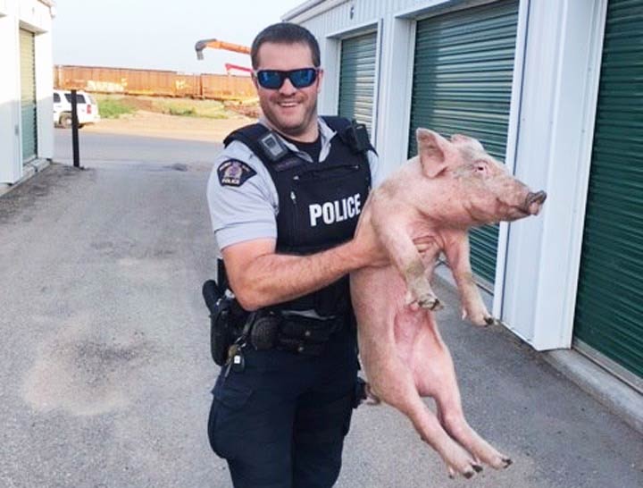 An RCMP member caught a loose pig in Kindersley, Sask., this past weekend.