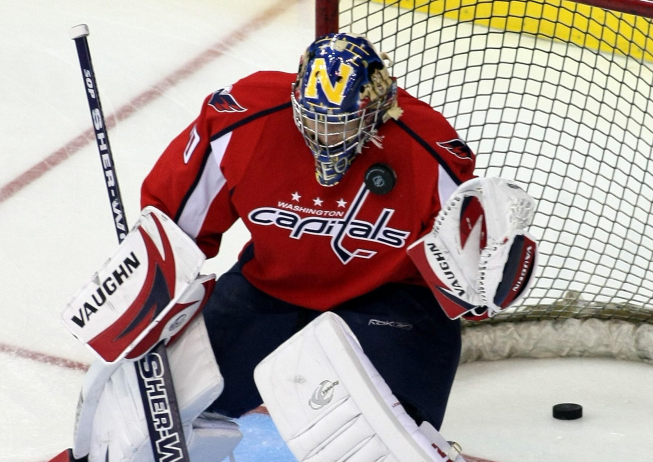 Brett Leonhardt dressed as an emergency backup goalie for the Capitals in 2008. This photo was taken during warmup. AP Photo/Luis M. Alvarez
