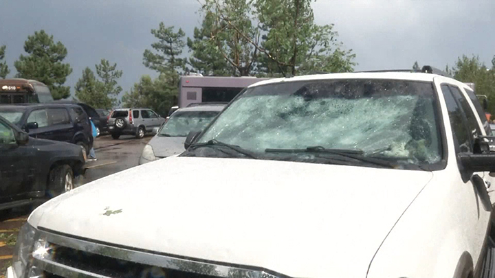 The Cheyenne Mountain Zoo suffered extensive property damage in Monday afternoon’s short but intense storm. The storm, with baseball-sized hail, hit as about 3,400 people were at the zoo southwest of downtown Colorado Springs and. Cars in the zoo’s parking lot were damaged as they were pummelled by the hail.