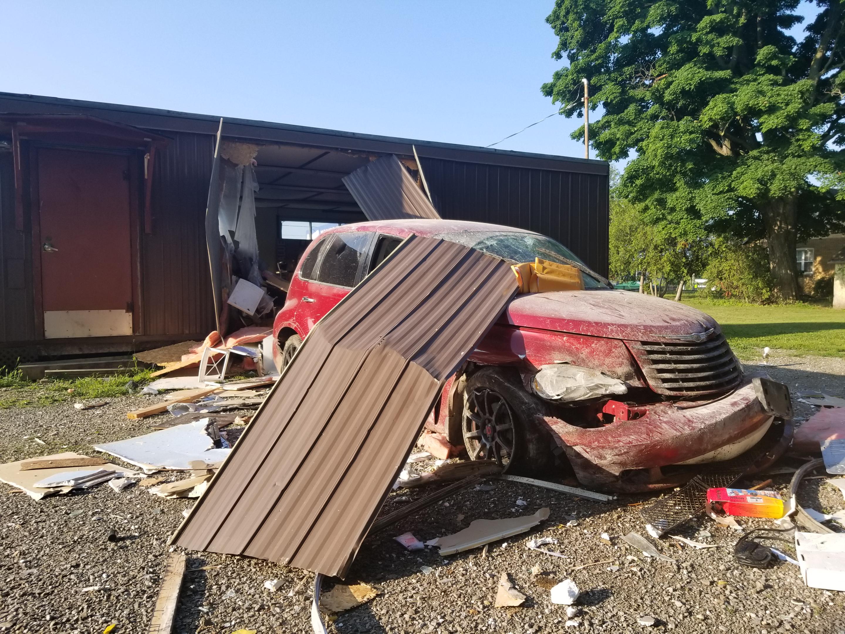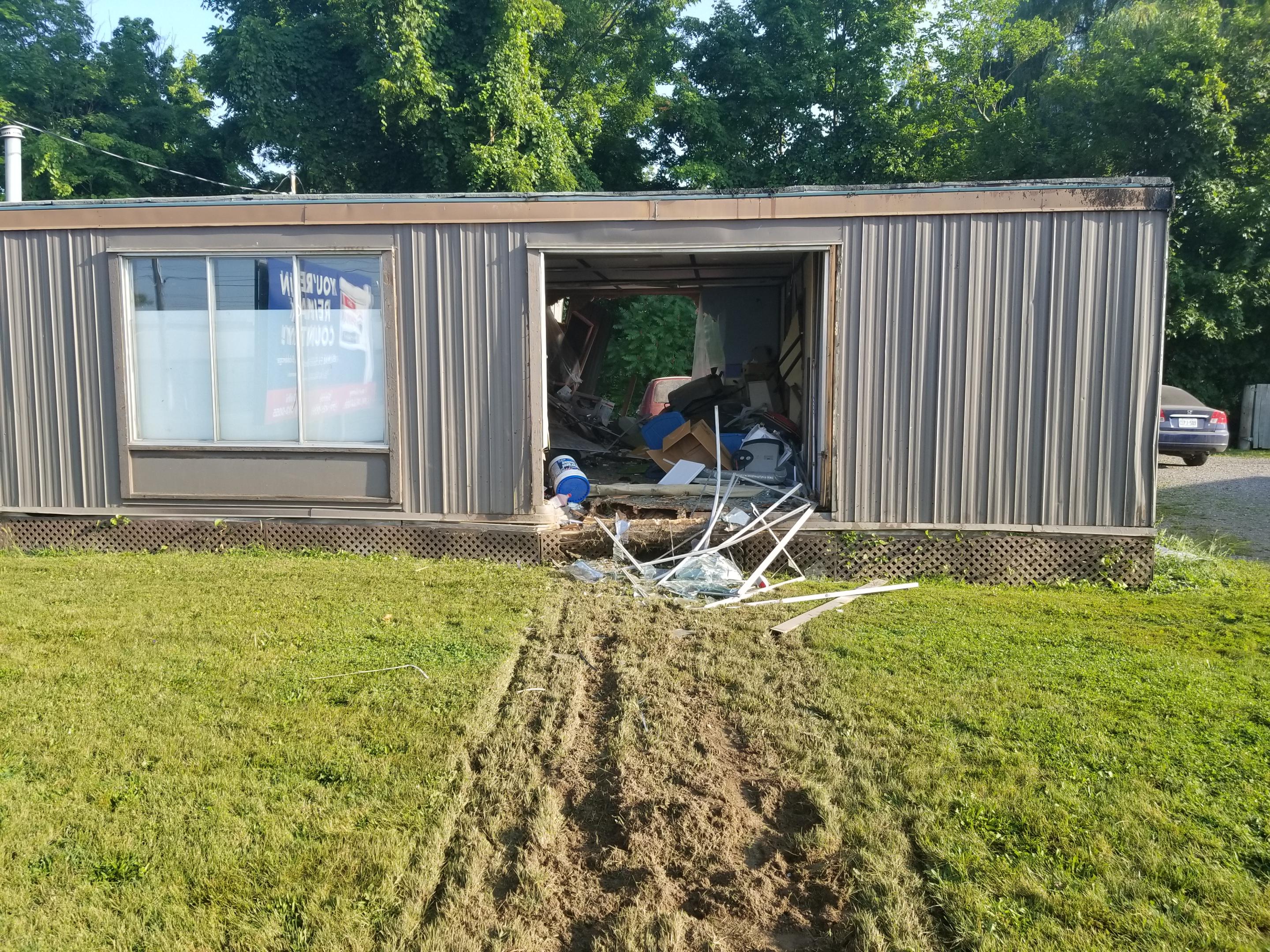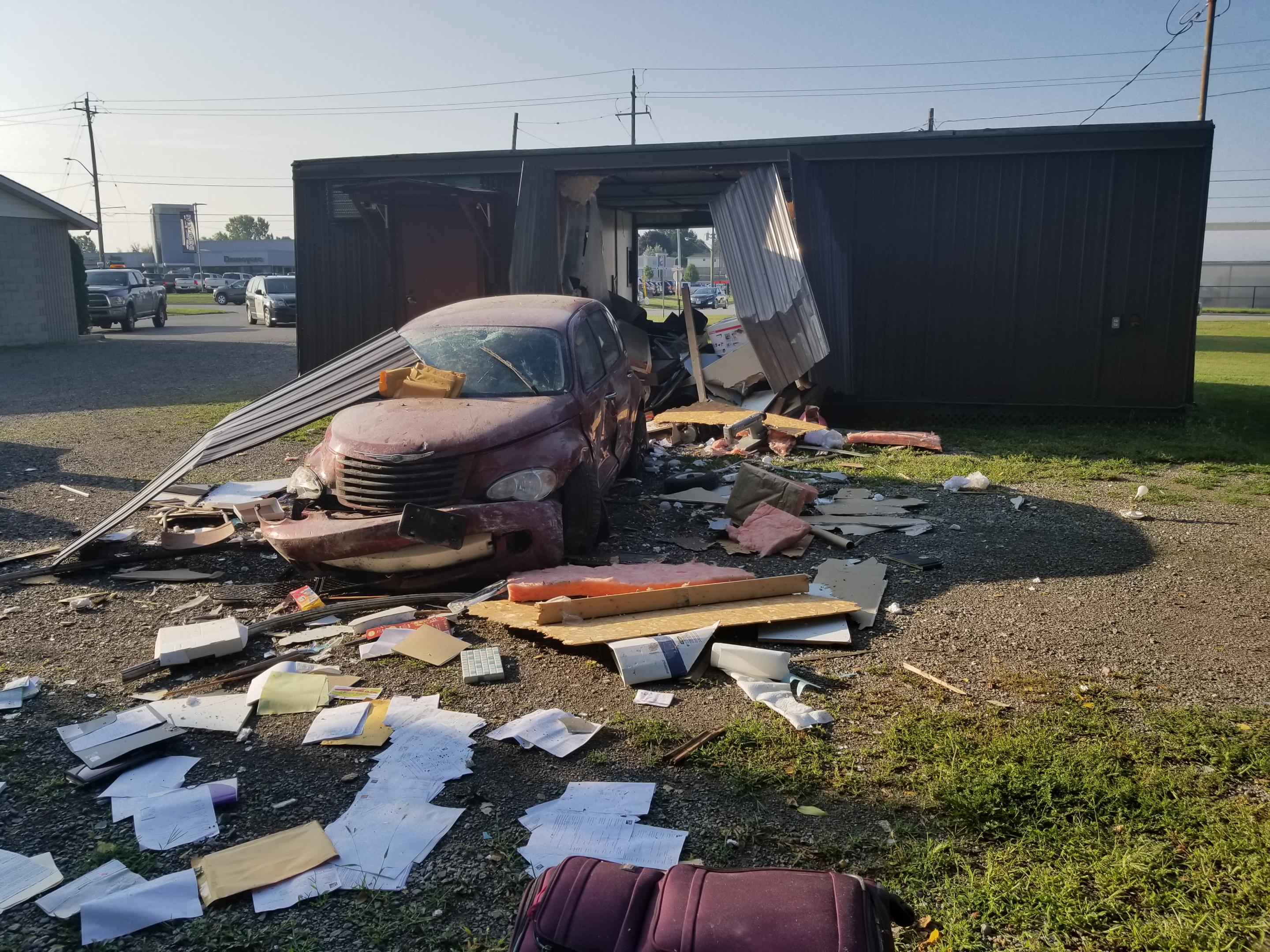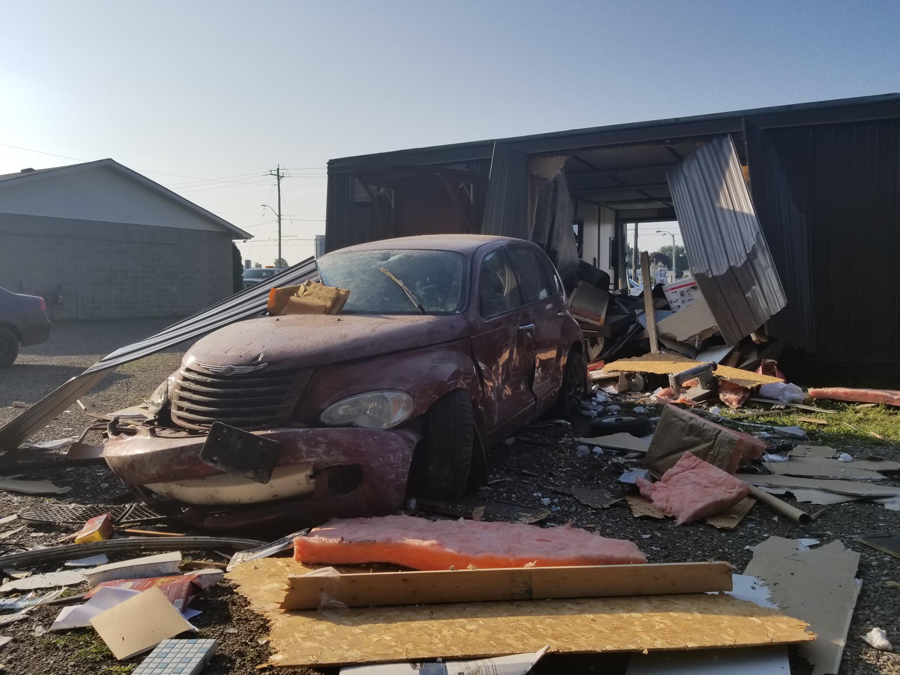 The crash occurred at roughly 7:40 a.m. Thursday on Queensway East. The investigation determined a vehicle heading north on Donly Drive North crossed over Queensway East and crashed through the building.