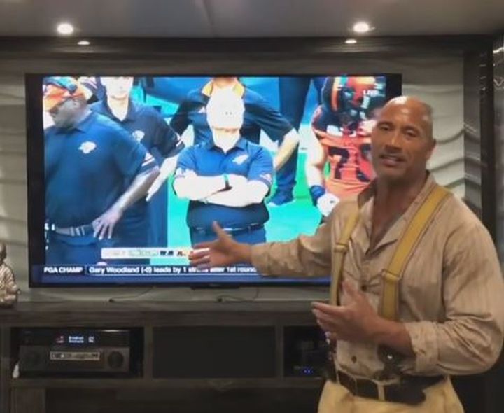 During a break from filming his latest project, Disney’s Jungle Cruise, Johnson posted a video of himself watching the Lions on TV as they took on the Edmonton Eskimos at BC Place.