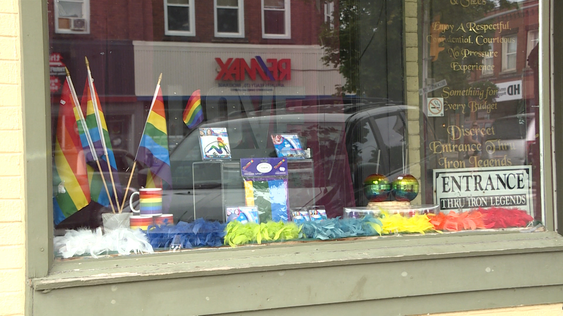 Some area businesses have set up supportive displays ahead of the parade, and a Pride flag now hangs in front of the town hall.