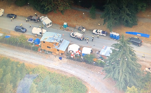 Burnaby RCMP says 11 people were removed from the camp, and five were arrested and have since been released.