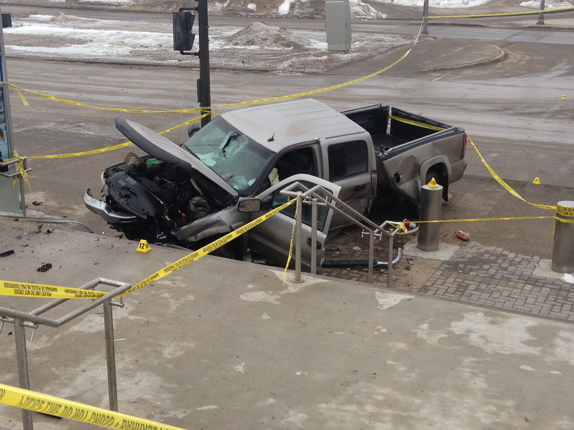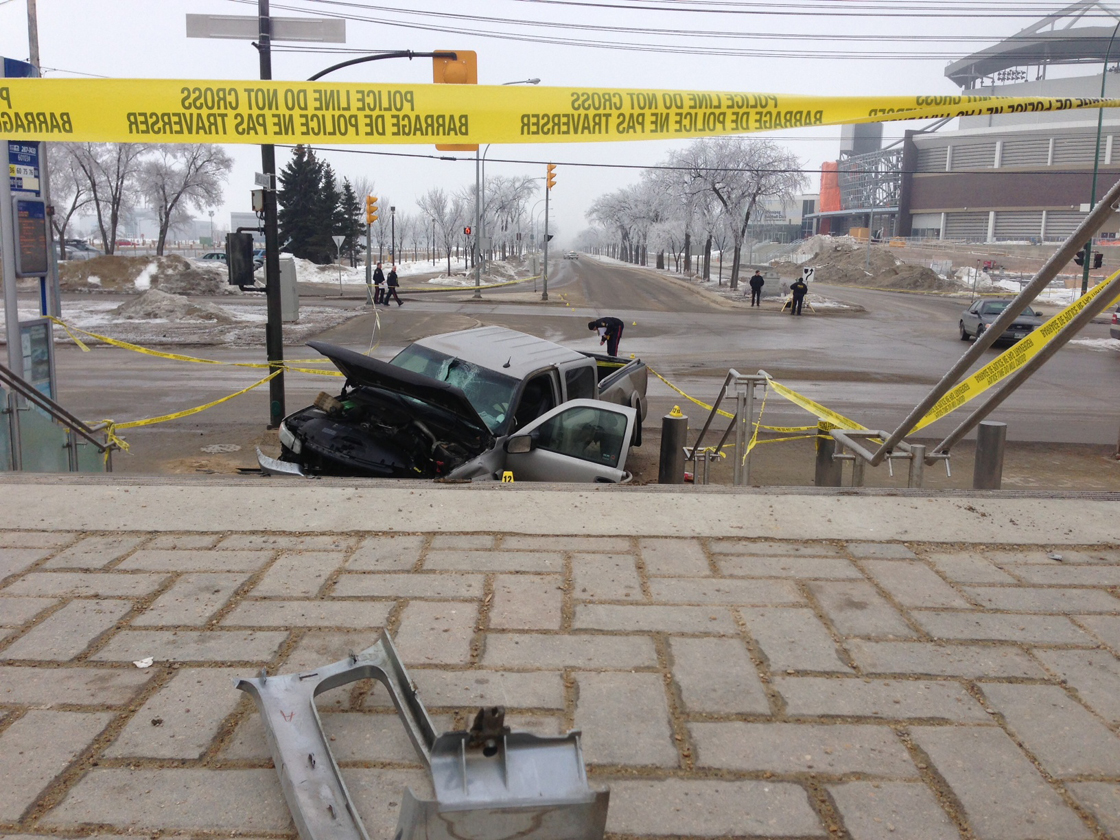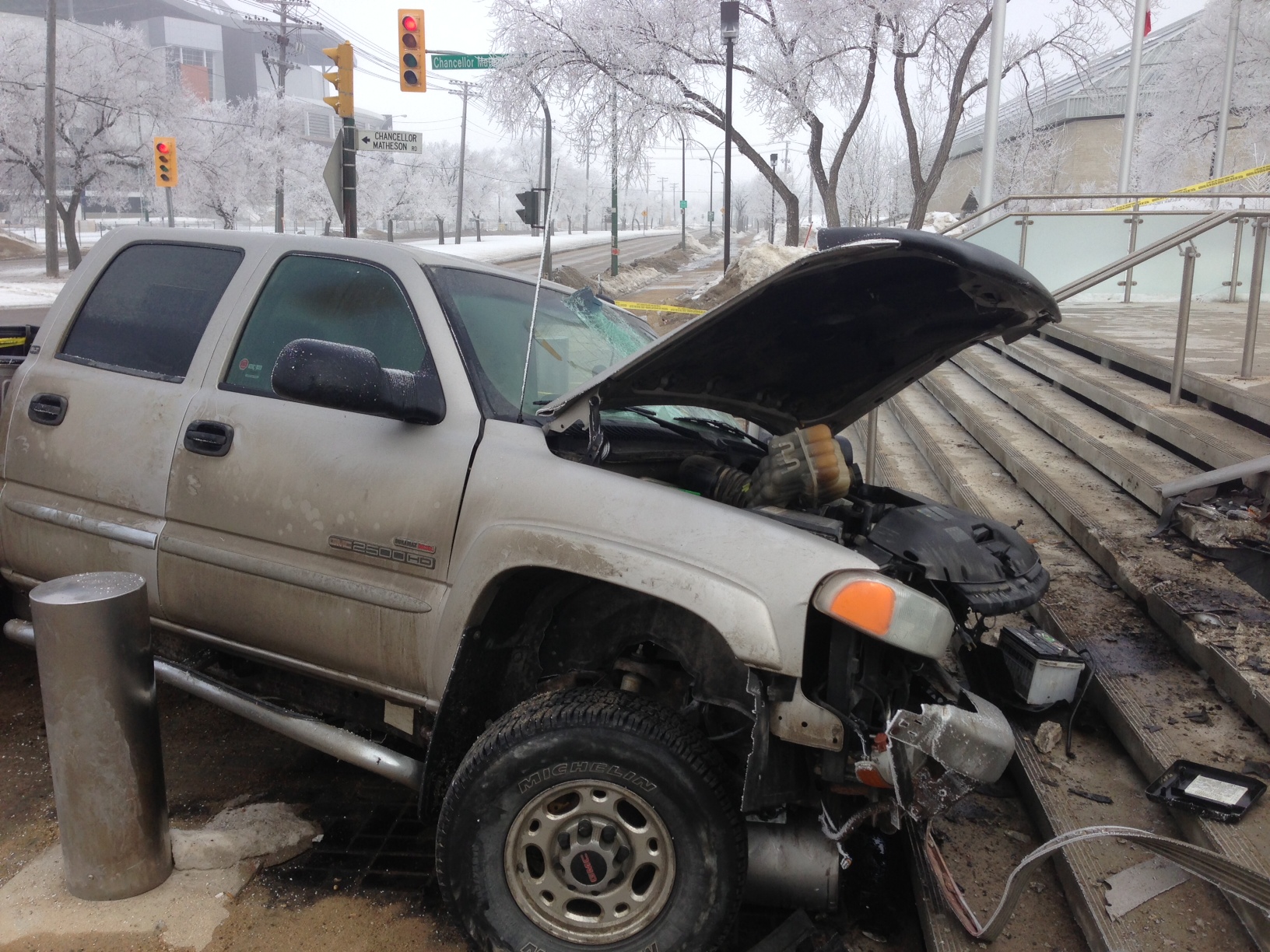 A GMC pickup truck was rammed into a set of outdoor stairs at the intersection of Chancellor Matheson Drive and University Crescent.