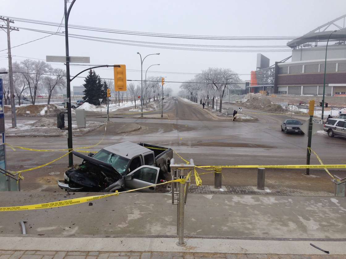 An intersection at the University of Manitoba re-opened Friday afternoon after a bizarre-looking early morning crash that involves apparently serious injuries.