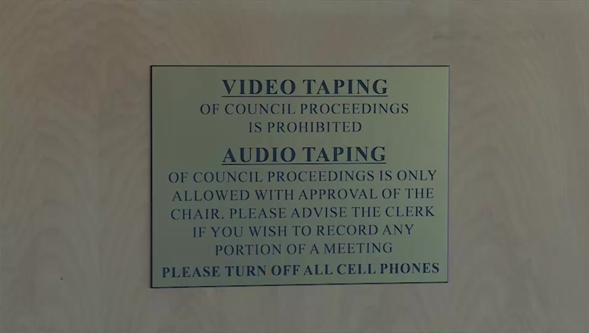 A plaque was drilled into the door of where the city council meetings occur that says all video and audio recording devices are prohibited, which mayoral candidate Lorna Willis does not agree with.