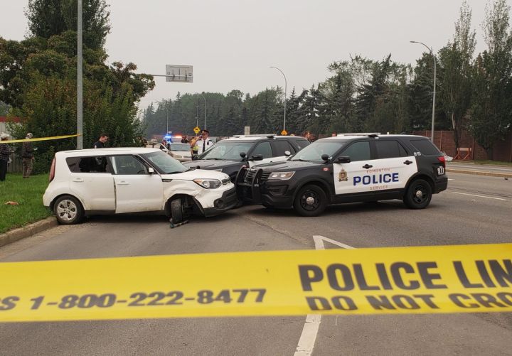 Officers pursued the suspect vehicle — a white Kia Soul — south side of the river, eventually ramming the car and stopping it on 75 Street near 101 Avenue.