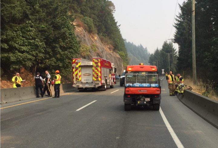 “The sewage spill prevents travel on the highway. We ask for patience from drivers who are affected by any delays as emergency crews deal with the closure of Highway 1,” Cpl. Chris Dovell of the West Shore RCMP said.