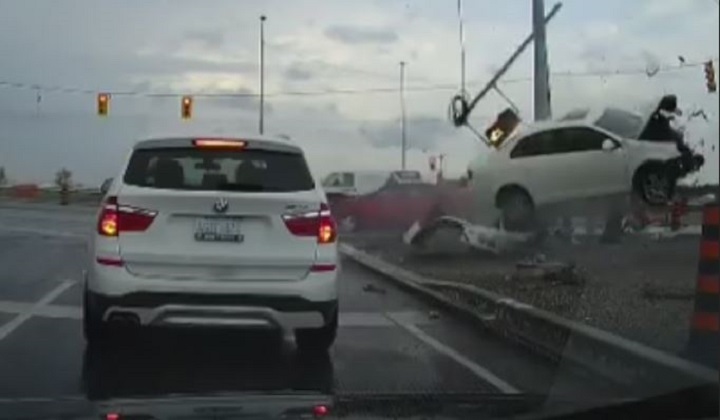 “One of the cars got airborne … I panicked a little bit initially, but I stopped my car where I was there. I got out of the car and checked on the occupants,” David Ursino, who captured the video as he was on his way to work, told Global News Wednesday evening.