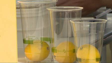 The lemonade containers and straws are all corn by-products, which biodegrade faster than their plastic counterparts.