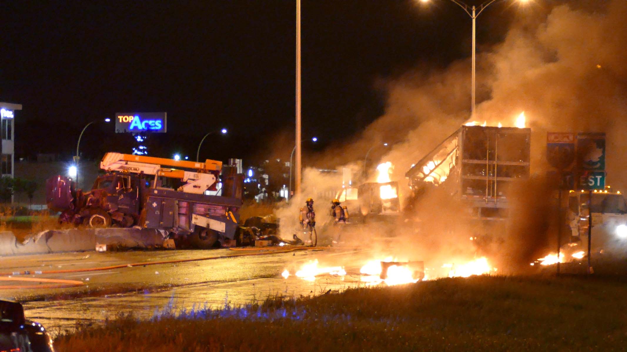 Firefighters battled the blaze on the highway. Provincial police urged motorists to avoid the area as the eastbound highway was closed until later in the day.