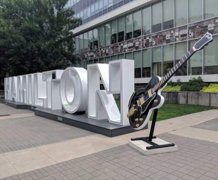 A 10-foot tall guitar has been installed in the city hall forecourt, next to the Hamilton sign.