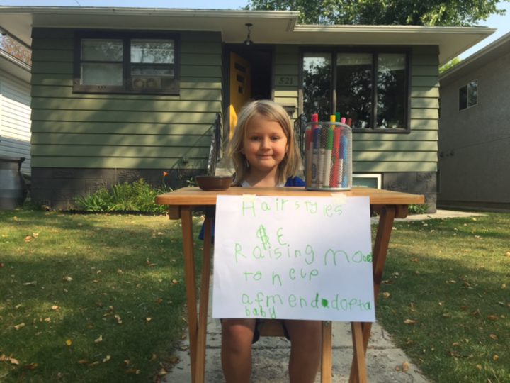 For a few days in a row, Madden Friesen has sat on a quiet residential street just off of Broadway Avenue in Saskatoon. Instead of a lemonade stand, she is offering stylish and sassy hairdos for a donation.