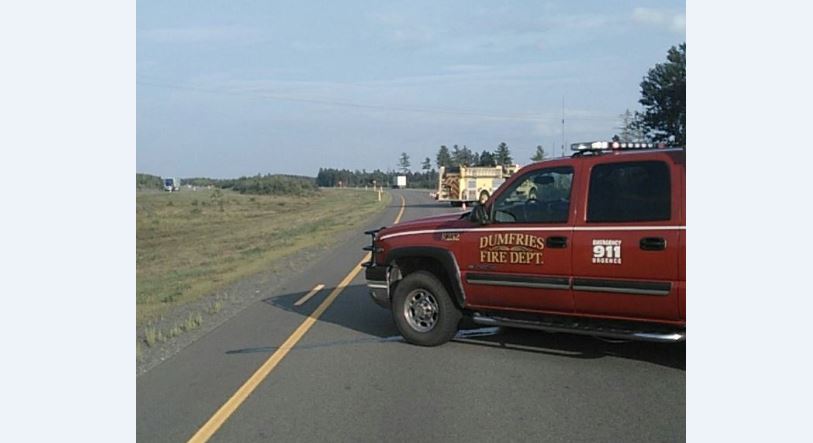 Marco Boonstoppel of the Dumfries Volunteer Fire Department says the eastbound lane of the highway is blocked off near Exit 231, and traffic is being backed off 50 metres due to the leak.