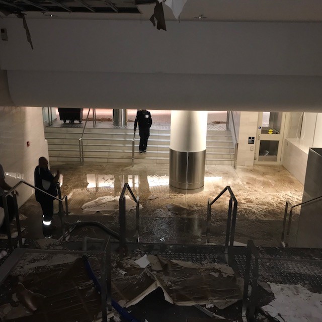 “Last night at approximately 11:30 p.m., a sprinkler outside of the former TD Bank at 201 Main St. in the concourse was struck by an individual who was in the ceiling space. As a result, there is extensive water damage to the drywall ceiling. The wheelchair lifts are also closed pending their inspection.