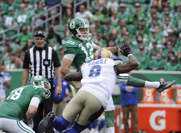 The Riders (6-4) moved into a tie with the Edmonton Eskimos for second place in the West Division. Edmonton will play the first-place Calgary Stampeders (8-1) on Monday.