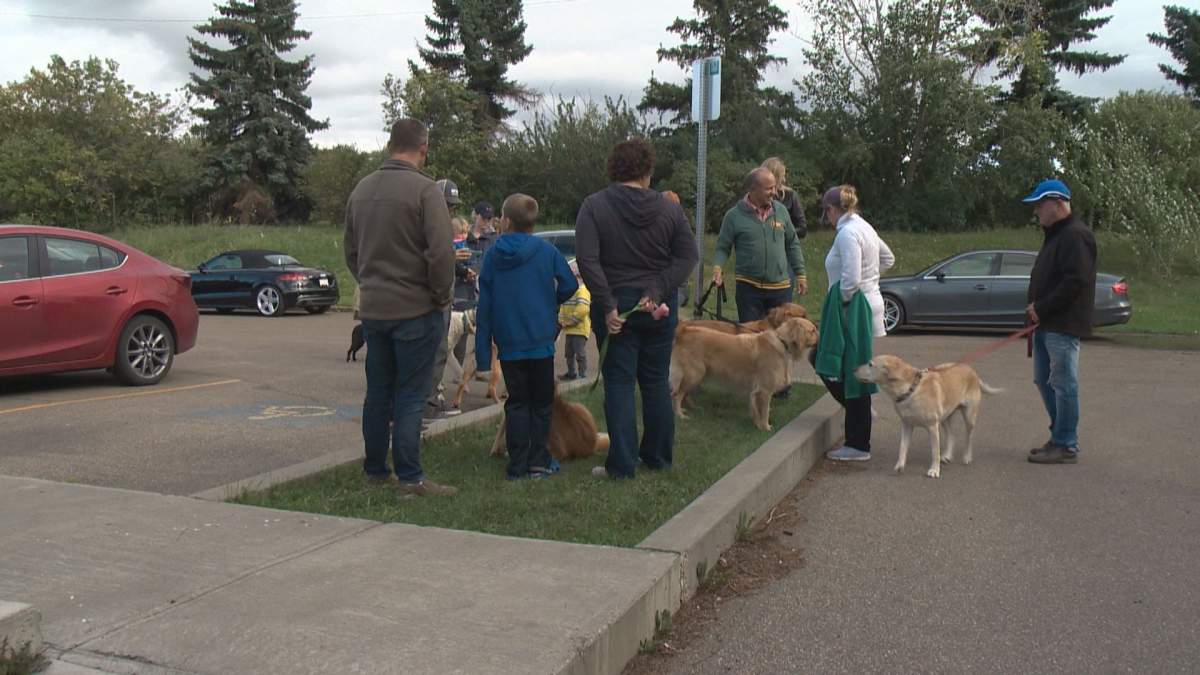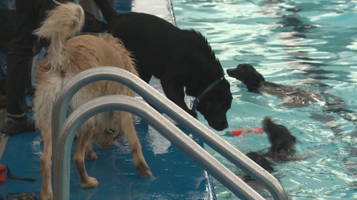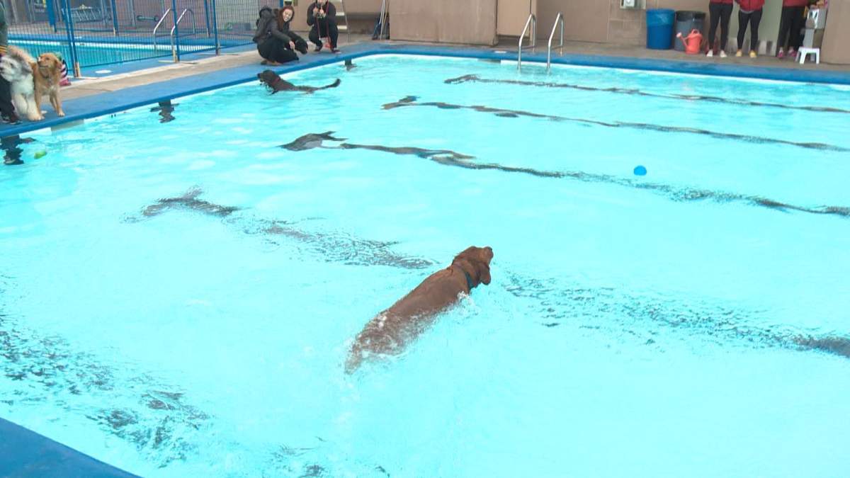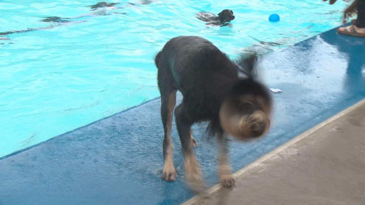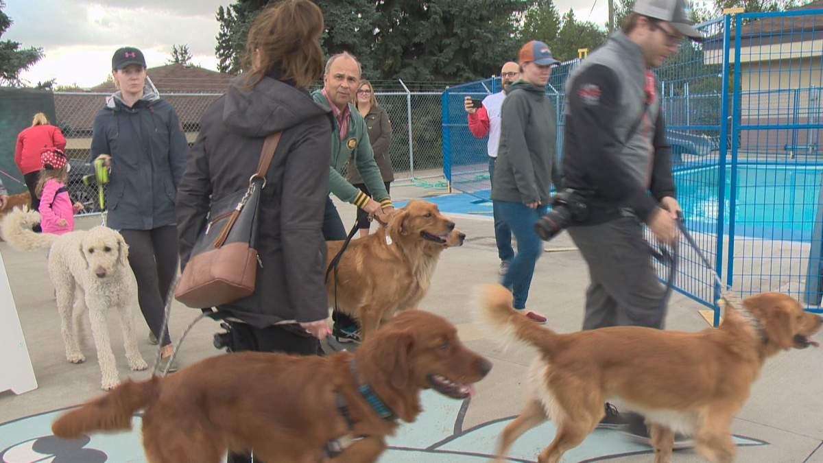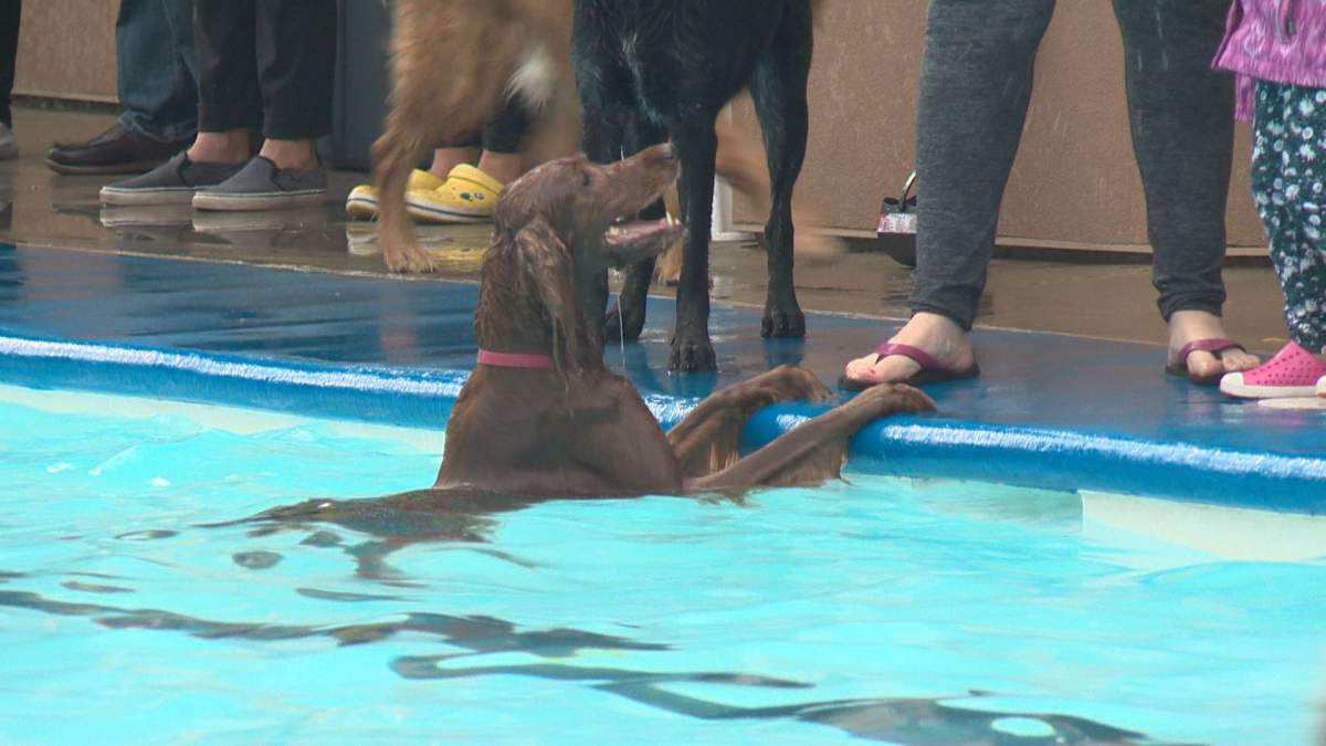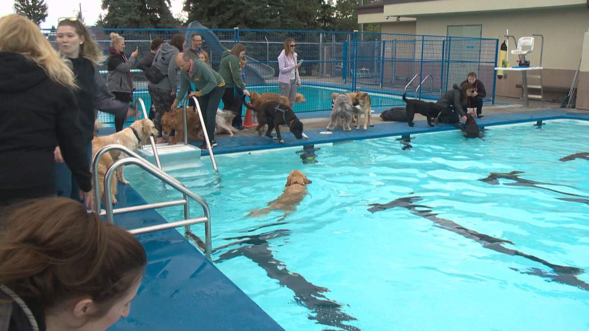 Despite a cloudy sky and scattered showers, dozens of dogs came out for a pawsitively perfect way to close out the season at the Grosvenor Pool in St. Albert.