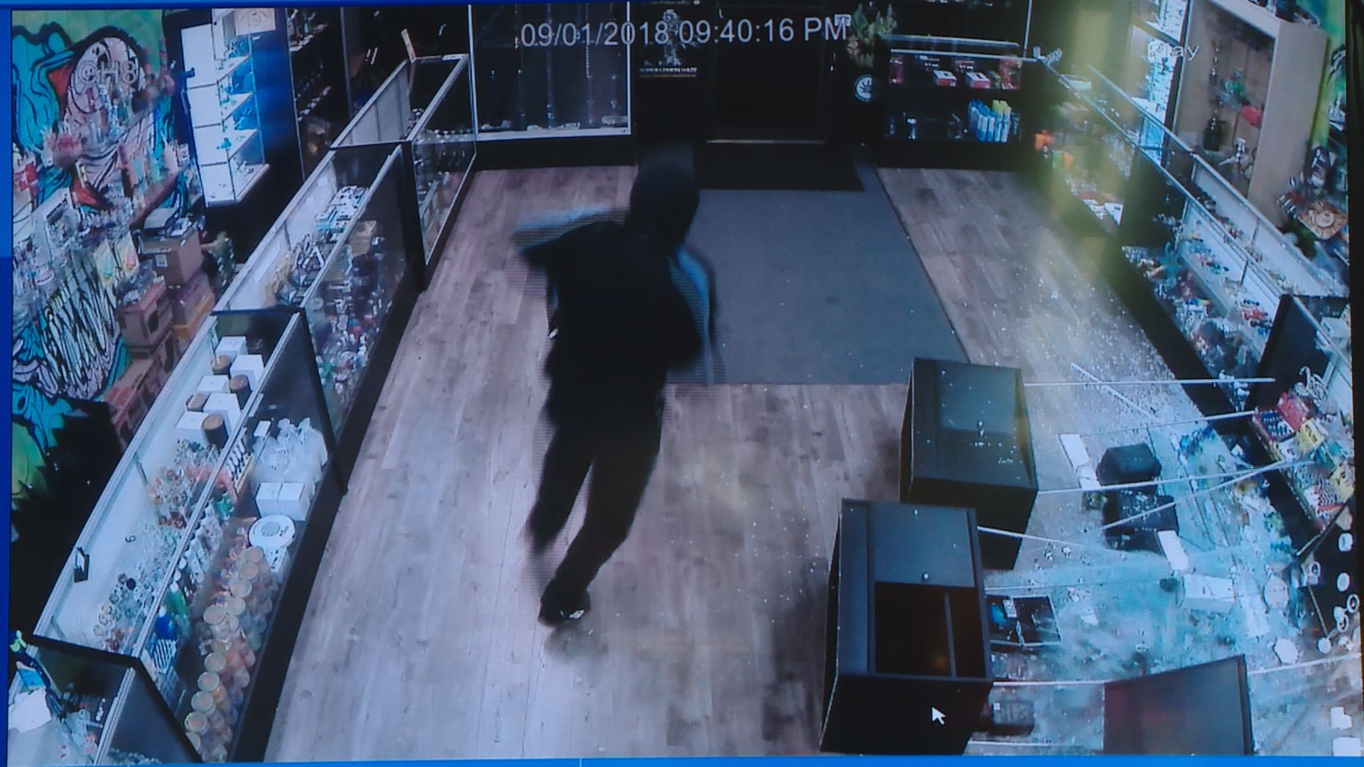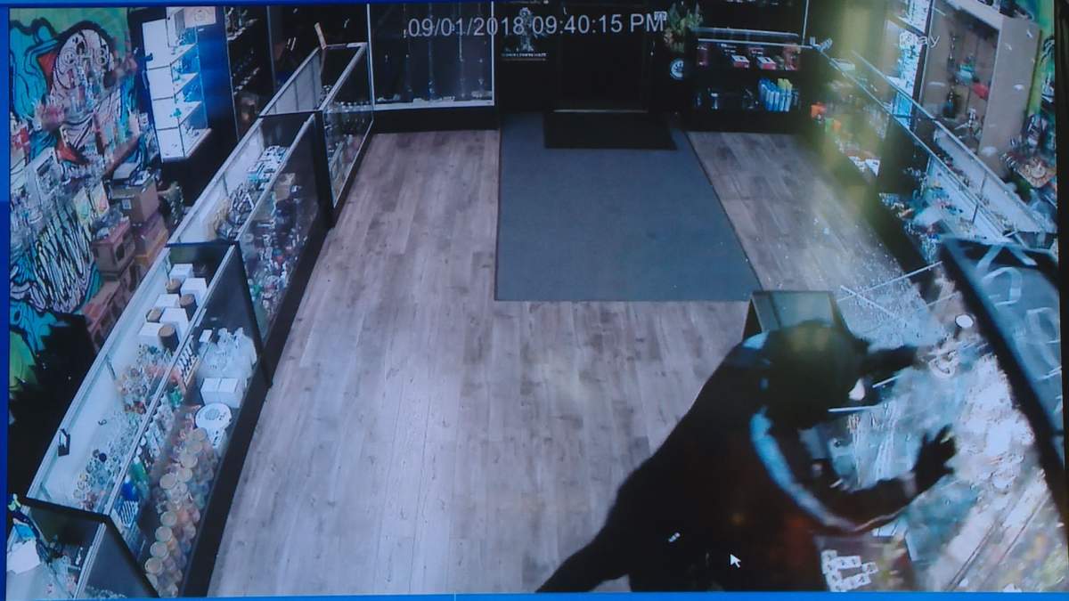 The video shows a man in a black hooded jacket walk into the store at around 9:40 p.m. Saturday, 20 minutes before the store was set to close for the night. Wearing a hat, sunglasses and carrying a duffle bag, the suspect can be seen pushing over three large glass cases then running out the front door.