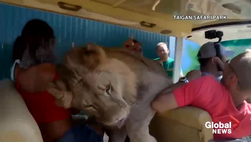 A video released by a safari park in Vilnohirsk, Crimea, showing the moment a lion got into a car with tourists has gone viral.