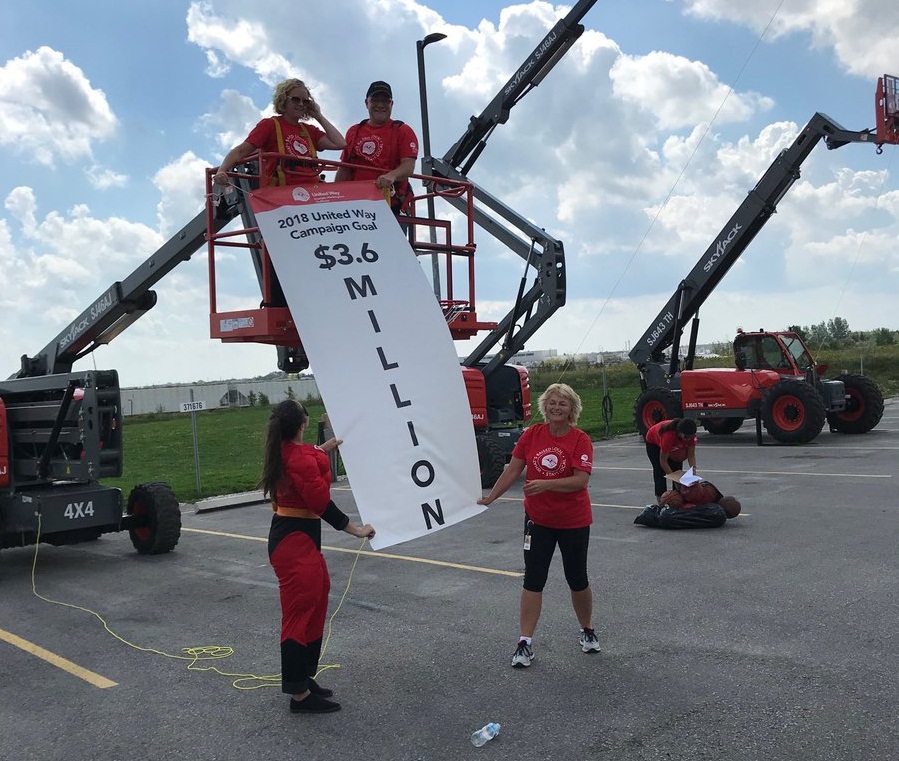 Despite the scorching temperature on Wednesday afternoon, the United Way Guelph Wellington Dufferin unveiled its 2018 fundraising goal by shooting basketballs into a net attached to a skyjack raised about 10 metres in the air.