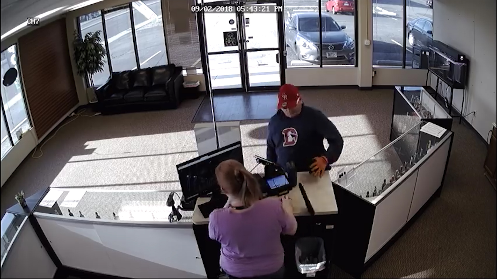 Security camera footage shows a man walking into the store on Sept. 2 and attempting to take out what police later said was a replica handgun. But it ends up flying over the counter instead.