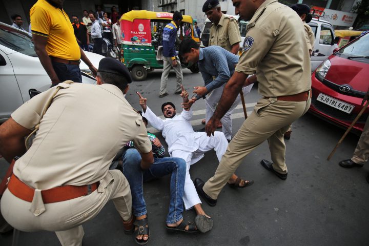 Television footage showed protesters breaking car and bus windows in Patna, the capital of Bihar.