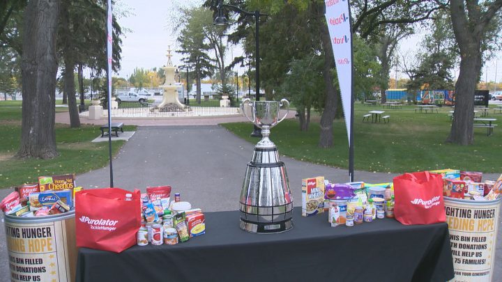 Saturday is the Purolator tackle hunger game, so anyone that brings a non-perishable or monetary food bank donation will be able to get their picture taken with the Grey Cup. Dave Parsons / Global News