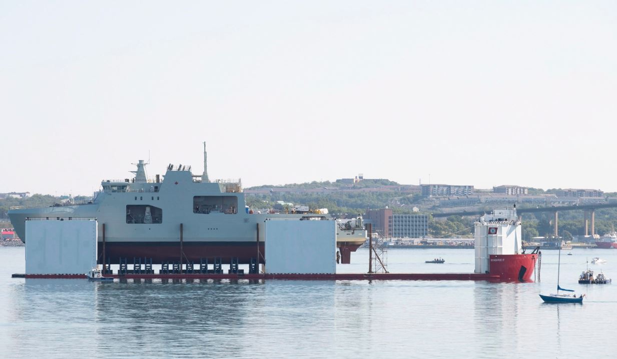 The future HMCS Harry DeWolf was transitioned onto a submersible barge on Friday, and was towed to its launch site in the Bedford Basin on Saturday.