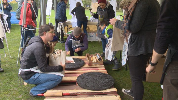 People celebrated the project at Prince’s Island Park on Saturday afternoon where they made imprints of the manhole cover designs on T-shirts and tote bags.